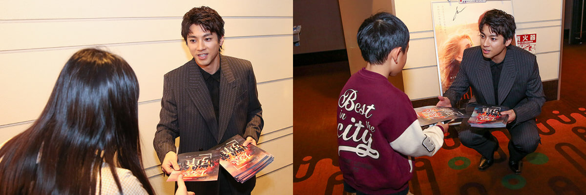 さらに、舞台挨拶の後には山田さんの熱望により、来場客への『爆弾』チラシ配りも実現!主演俳優としてさらなる大ヒットを願い、「『爆弾』もお願いします!」と一人一人にチラシを手渡す山田さん。来場客が驚き歓喜の声を上げる中、笑顔でチラシを配り続けていた。