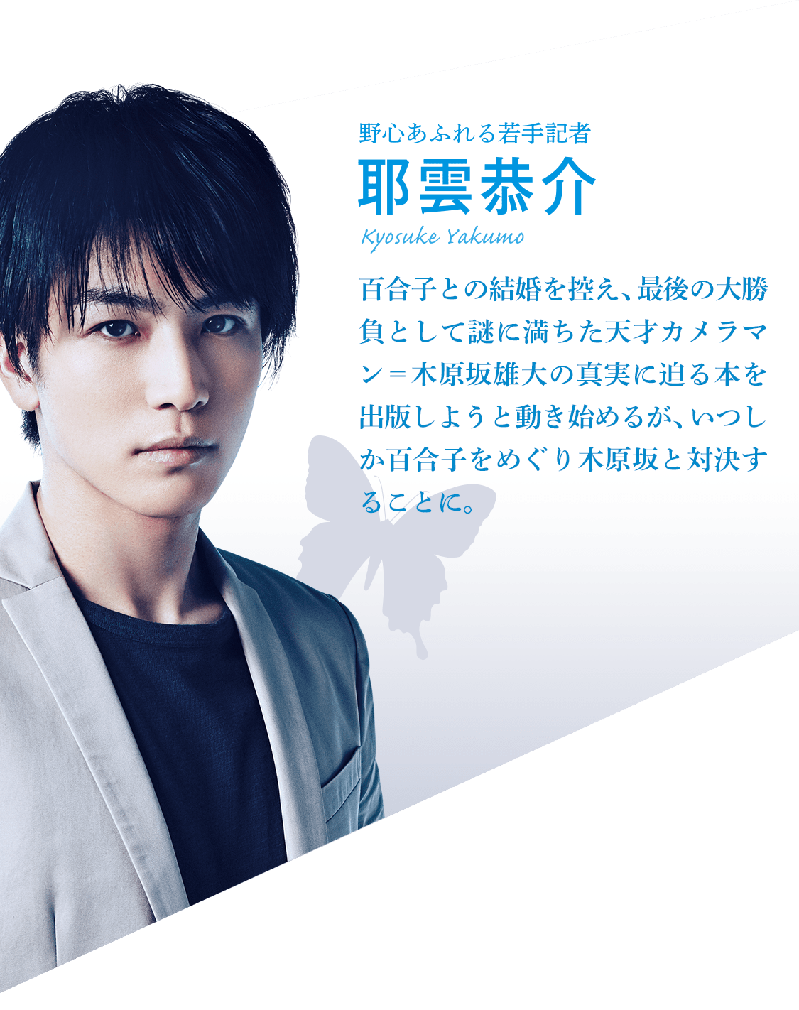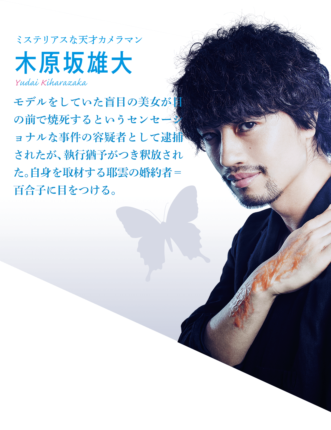 1991年7月18日生まれ。福岡県出身。近年の主な出演作は、映画『東京PRウーマン』(初主演/15)、『貞子vs伽椰子』(16)、『少女』(16)、『ピーチガール』(17)、ドラマ「嘘の戦争」(17)、「刑事ゆがみ」(17)、配信ドラマ「東京アリス」(17)など。今後、映画『友罪』(18年5月公開)、ドラマ「真夜中のスーパーカー」(18年3月28日放送/NHK BSプレミアム)に出演。 ミステリアスな天才カメラマン