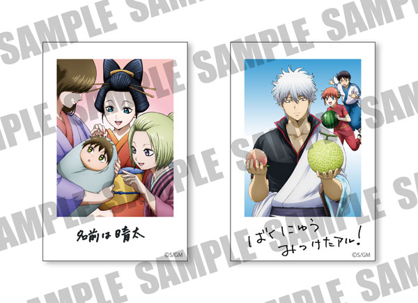 1枚は生まれたばかりの晴太を大事に抱く母親の姿と日輪と月詠の姿が映し出され「名前は晴太」と手書きのメッセージ付き。もう1枚はピーチ三太夫になるべく仕込みをする銀時、新八、神楽の様子を収めた1枚。2種類ランダム配布のためどちらが当たるかお楽しみ! -