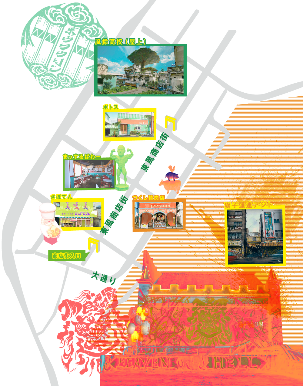 東風商店街が活気に溢れる一方、力の絶対信仰を掲げる獅子頭連のシマは、“略奪や破壊”をテーマに作られた。原作では線路の高架が防風鈴と獅子頭連のシマ境となっているが、本作ではアーケードを境にして震えるような獅子頭連のシマが広がる。「東風商店街と強烈なコントラストを作り、獅子頭連という寄せ集めのチームが略奪を繰り返してきたという空気を作り上げました。『ここから一歩足を踏み入れるとヤバい』という世界観を耳からも感じられるよう、音にも工夫を凝らしています」(加茂P)と街の気配にもしっかりとストーリーを織り込み、「獅子頭連のアジトは、廃ホテルの屋上に建てています。原作ではオリオン座という映画館がアジトになっているのですが、実はこの屋上にも“オリオン”という文字を見つけることができます」(西村P)というから注目だ。